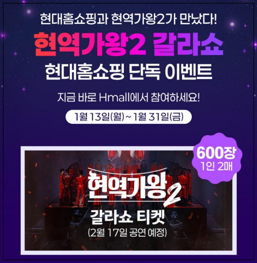 <2025 한일가왕전>에 출격할 트롯 국가대표 TOP7 선발전인 MBN 현역가왕 2에서 치열한 경쟁을 뚫은 7인의 무대를 현대홈쇼핑단독 이벤트로 응모기간 내 현역가왕 2 갈라쇼 해당하는 방송 상품을 구매하신 고객에게 티켓을 최대 1인 2매까지 증정하는 무료 이벤트입니다.